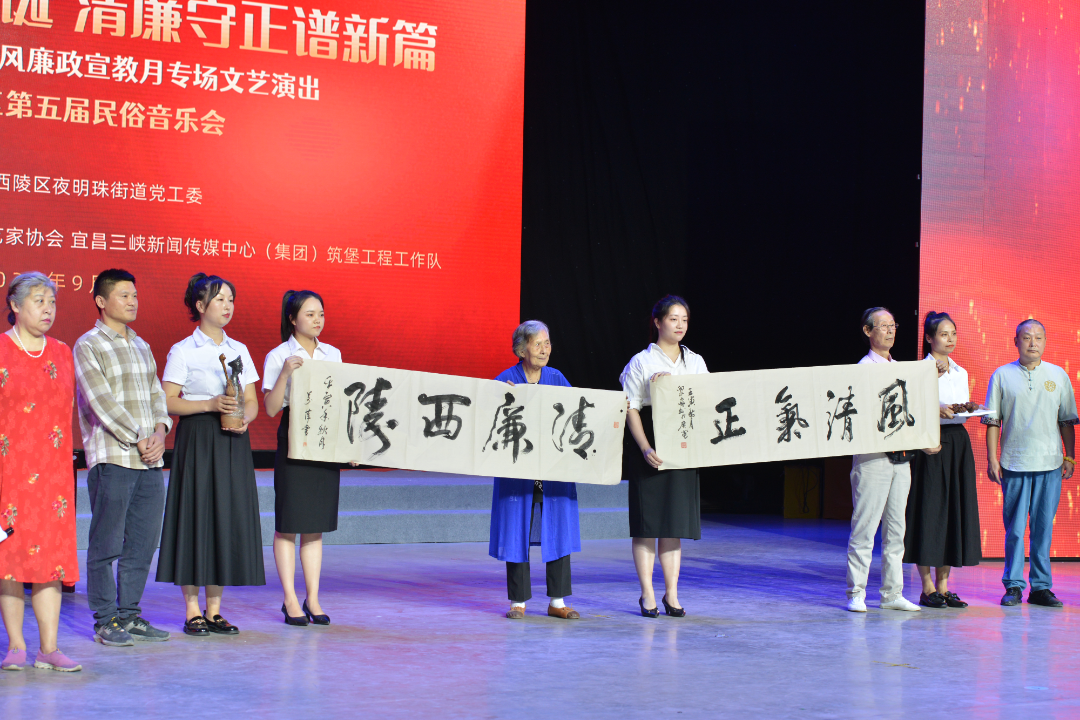 9月26日,在三峡广电演播大厅举办“同心筑梦庆华诞 清廉守正谱新篇”西陵区2022年党风廉政宣教月专场文艺演出。活动以三峡鼓乐《正气浩然》为开篇,以“清风廉韵”、“家国万里”主题分为上下两篇,包含舞蹈《蒲扇摇起清风来》、《水韵莲“廉”》,音乐剧《中华好家风》及合唱《廉洁自律准则歌》等高质量文艺节目。演出现场同步展示了由民间艺术家创作解读的廉洁自律主题艺术浮雕、民间工艺等作品,并邀请书法家现场泼墨,书写“清廉西陵”“清风正气”。党史及廉政知识有奖问答环节观众们纷纷互动不断、踊跃发言,现场气氛热烈活跃。活动现场还为宜昌三峡广电中心演播大厅、西陵区文化馆、西陵区民协等5家单位进行了“西陵区清廉文化实践基地”集中授牌。
