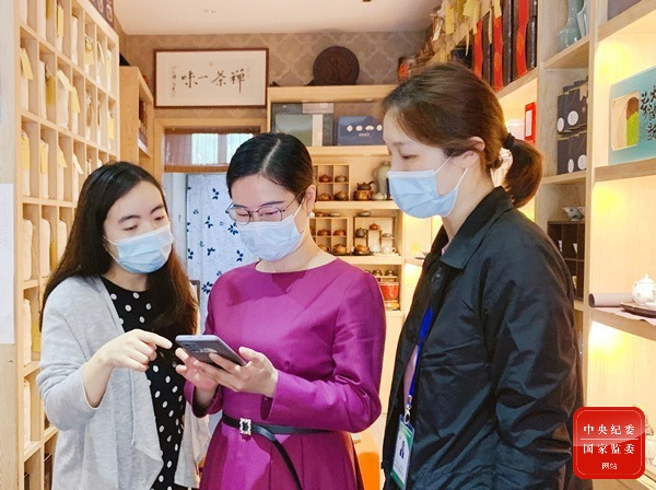 端午将至,杭州市上城区纪委监委聚焦“天价茶”有关问题开展监督检查,狠刹春茶销售背后的送礼之风、奢靡之风。小营街道纪工委干部走访辖区高档茶品经营户,查看相关销售记录,了解掌握问题线索。(杭州市上城区纪委监委 王卓俊 摄)