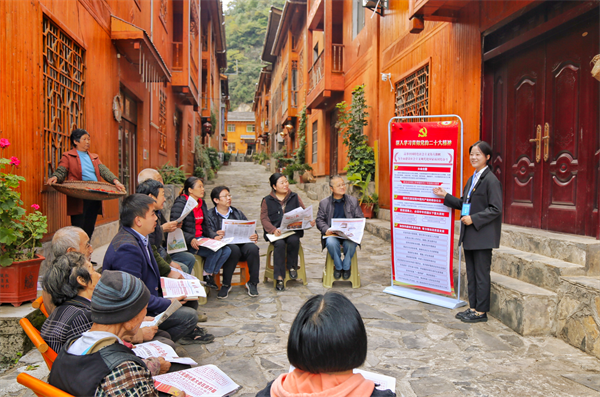 湖北省兴山县纪委监委组织“纪检监察青年纵队”分赴村(社区)宣讲党的二十大精神,通过屋场会把党的二十大精神面对面传递给群众,凝聚奋进力量。图为近日,该县纪检监察干部在白竹村宣讲。万晶晶 摄