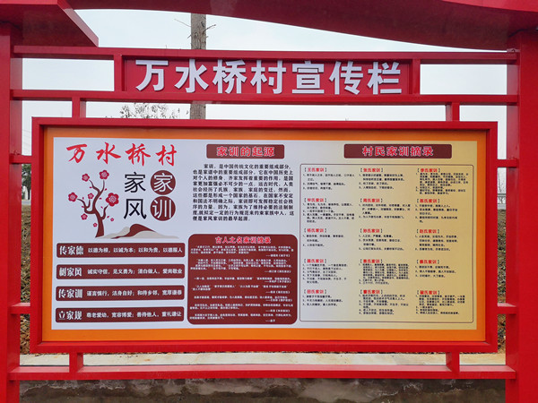 “妻贤子孝,耕读传家。牛无力拖横耙,人无理说横话。”经典家训家规、家风文化立在万水桥村龙头湾每家每户的门口,文明新风扑面而来。为树立文明新风,万水桥村开展“家风家训”挂牌活动,鼓励村民“晒家规”“亮家风”“学家训”。