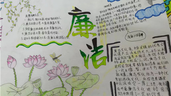 “清”濯我心,“廉”修我行。各班通过主题班会,让每一个学生学习《廉洁文化进校园》读本,了解古今伟人廉洁精神,从小树立崇尚正气的坚定信念。5月20日,师生总动员,以班级为单位,开展了“学廉洁,做栋梁”现场手抄报和书法绘画赛。作品灵秀,质朴生动,内容充实,充分体现出廉洁文化的教育、示范、熏陶和引领作用,实现了“内化于心,外化于行”。