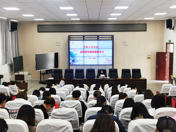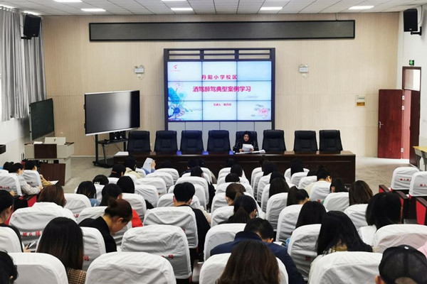 图为该市丹阳小学组织教职工开展酒驾醉驾典型案例学习