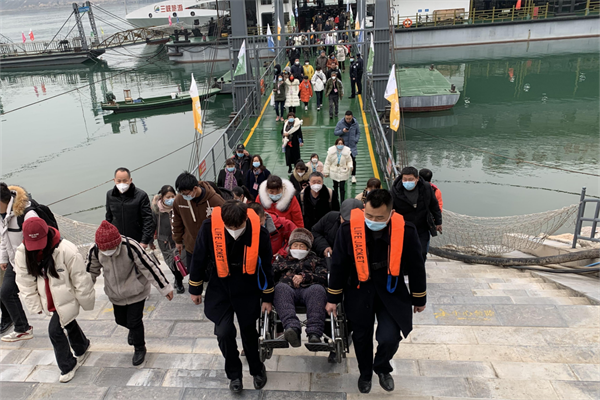 图为春节期间,长江游轮公司工作人员帮助游客平安出行。