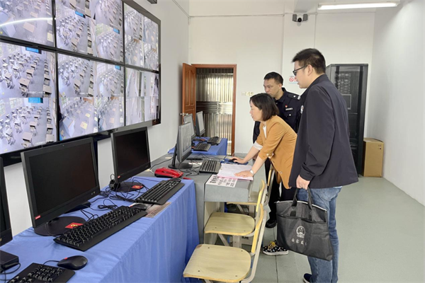 该市纪检监察干部在枝江市第一高级中学视频监控室查看设备运行情况