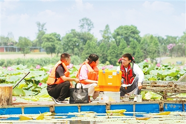 湖北省枝江市纪委监委采取“室组地”联动监督模式,将湿地修复、长江岸线治理纳入政治监督重点,坚决整治生态环保领域不作为、慢作为等问题,以有力监督守护绿水青山。图为近日,该市纪检监察干部在金湖国家湿地公园了解水质监测工作情况。任薇 摄