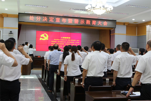 聚焦突出问题,开好“靶向药”。扎实开展“警示教育零距离”系列活动,选取今年查处的部分“一把手”和“年轻党员干部”违纪违法案例作为反面教材,拍摄本地专题警示教育片《欲壑深渊》,配以纪法精品课、主题研讨、旁听庭审等“自选套餐”,将警示教育与促改促治一体推进,从处理处分“一张纸”到警示教育“一堂课”,再到整改提升“一串事”,实现综合治理、源头治本。图为该市教育系统就黄某某违纪违法案件开展处分决定宣布大会。(枝江市纪委监委)
