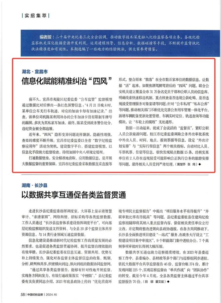 近年来,“四风”隐形变异问题花样翻新,隐蔽性增强,查处的难度不断升级。宜昌市纪委监委以全省“数字纪检监察应用年”活动为契机,建设数字平台、搭建监督模型,以信息化手段助力监督检查,持续加固中央八项规定堤坝。