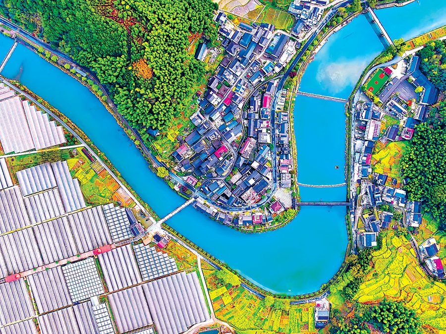 浙江省淳安县践行“先富帮后富、区域共同富”的理念,建立多个现代化共富农业产业园,结合区域资源分片发展特色经济。图为该县枫树岭镇下姜村,青山相伴、绿水环绕,农居错落有致,现代化休闲农业产业园区整齐有序,呈现出一派乡村振兴美景。毛勇锋 摄