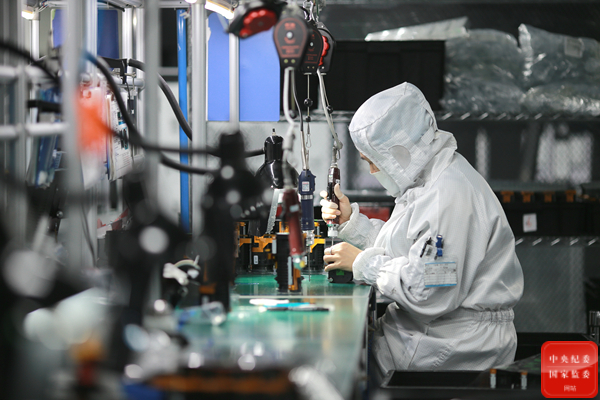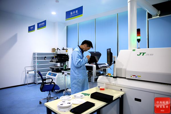 在湖北宜昌首家专业型国家级孵化器——微特智慧谷孵化器内,专业的技术平台和服务平台为入驻的数十家企业提供创新创业服务。微特智慧谷的这家龙头企业致力于起重安全保护装置、自动化检测控制系统等研发与生产。图为公司试验人员在检查电路板贴片是否合格。(湖北省宜昌高新区纪检监察工委 徐丽平 摄)