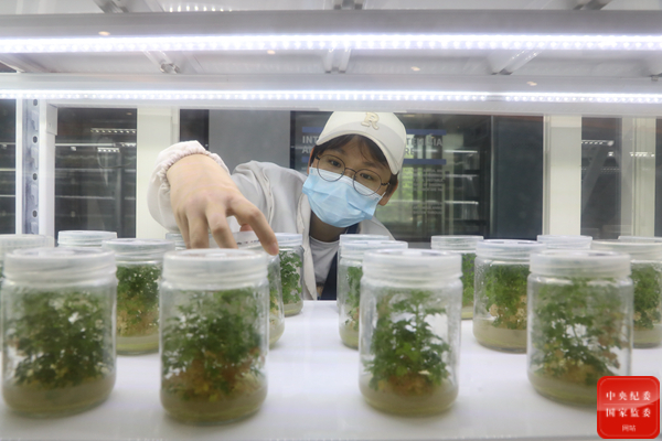青蒿素是治疗疟疾的特效药物,广西壮族自治区融安县是全国青蒿种植面积最大的县、全球最大的青蒿素生产基地。该县打造“公司+基地+科研单位+协会+农户”的闭环模式,形成完整生产产业链。图为制药公司科研人员在观察培育青蒿新品种。(广西壮族自治区融安县纪委监委 李开智 摄)
