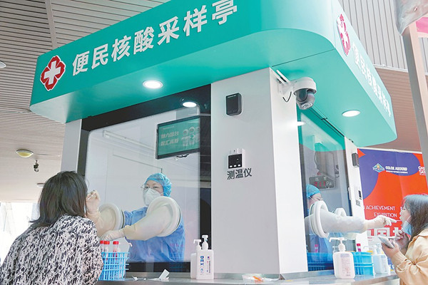 山东烟台首批便民核酸采样亭投入使用。图为5月24日,医务人员在烟台高新区的一个核酸采样亭中为市民进行核酸采样。 (图片来源:人民视觉)