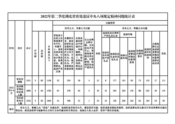 7月7日,湖北省纪委监委公布了2022年第二季度全省查处违反中央八项规定精神问题汇总情况。4-6月,全省共查处违反中央八项规定精神问题1241起,批评教育帮助和处理1880人,其中,党纪政务处分1332人。
