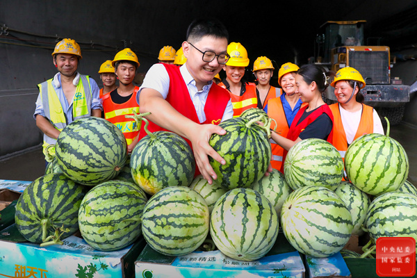 高温天气,杭州市桐庐县相关单位开展“夏日送清凉”活动,为奋战在一线的建筑工人、环卫工人、外卖配送员等户外劳动者送上清凉。图为桐庐团县委组织青年志愿者,到杭温铁路站前7标段工地慰问一线施工人员。(杭州市桐庐县纪委监委 王飞 摄)