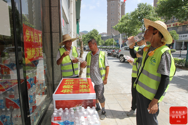 仲夏酷暑,江西省九江市修水县的社会爱心商家为交通警察、环卫工人等室外一线工作者设立“免费领水站”,24小时无偿提供冰镇饮用水,为室外工作人员设立临时休息场所。(江西省修水县纪委监委供 赵球 摄)