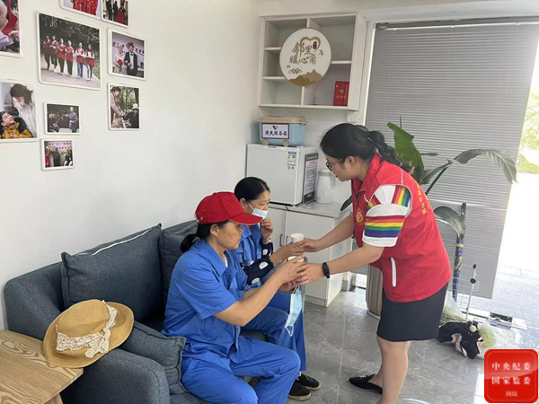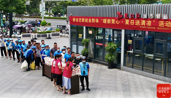 炎炎夏日,骄阳似火,许多户外劳动者冒着酷暑坚守工作岗位。安徽省马鞍山市雨山区鹊桥社区在服务大厅开辟邻里“暖心角”,为鹊桥游园周边环卫工人等户外劳动者提供“清凉”服务,免费提供饮用水、小食、应急药品等。(安徽省马鞍山市雨山区纪委监委供 刘敏 摄)