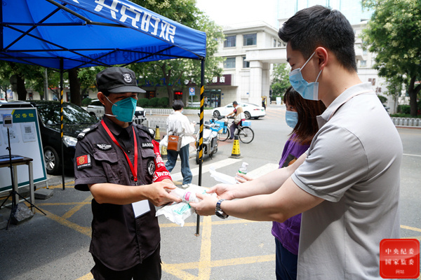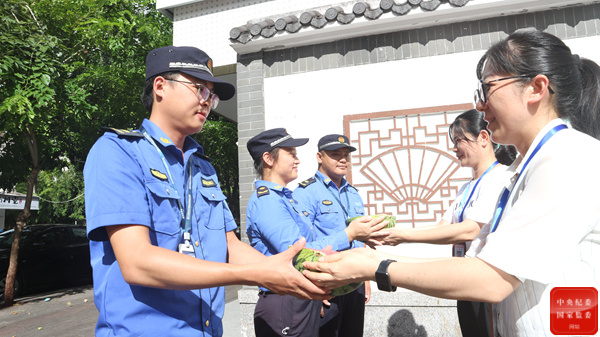 近期,北京连日高温,西城区纪委监委机关干部前往辖区内各个街道值守卡口,为奋斗在社区一线的劳动者们送去清凉物资和防疫物资,为高温下的劳动者撑起爱心“遮阳伞”。(北京市纪委监委 孙一淳 摄)