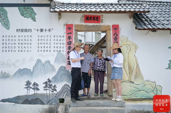 江西省寻乌县深挖用好廉洁文化资源,坚持“一乡一品”“一村一特”,为乡村振兴注入廉洁动力。图为纪检监察干部在寻乌县南桥镇南龙村向农户了解廉洁文化示范点建设情况。(江西省寻乌县纪委监委 何斌杰 摄)
