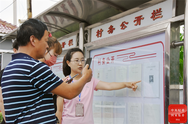 为助力清廉村居建设走深走实,辽宁省盘山县纪委监委以“阳光三务”建设为抓手,推进村(居)务公开,切实加强基层人、财、事、权全方位立体监督作用。图为纪检监察干部在张家村现场为群众讲解三务“码”上公开的内容及查询方式。(辽宁省盘山县纪委监委 马新晋 摄)