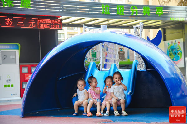 福建省三明市三元区将老旧小区改造与优化人居环境相互融合,因地制宜建设休闲小广场、儿童休闲乐园等场所,美化社区环境、丰富居民生活。图为城关街道山水社区的小朋友在社区儿童微乐园玩耍。(福建省三明市三元区纪委监委 陈盛雄 摄)