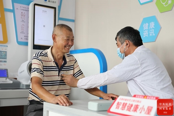 江西省彭泽县在基层村社建设“智慧健康小屋”,提升社区基层医疗服务水平,以大数据助推精准医疗新模式,提高医疗服务效率,改善群众健康水平。图为芙蓉墩镇的智慧健康小屋医务人员为居民进行健康体检。(江西省彭泽县纪委监委 汪昱君 摄)