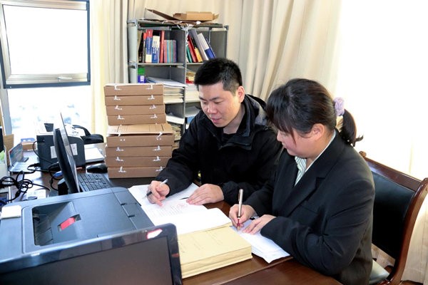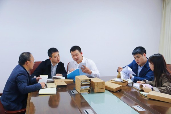 图为案件协作核查组在集中查看账目
