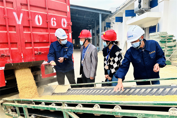 图为纪检监察干部在津洋口粮仓检查粮食入库情况