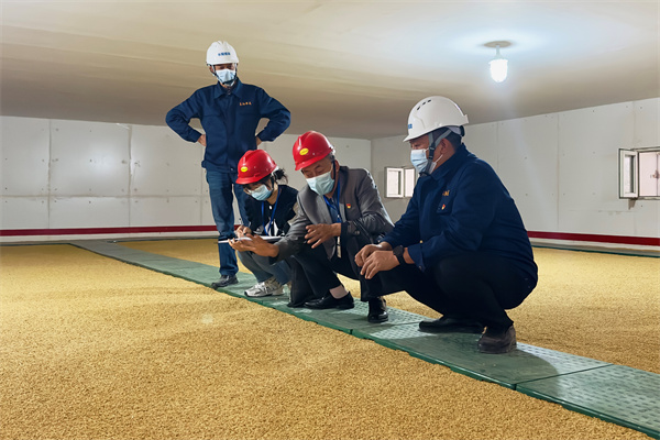 图为纪检监察干部对储备粮日常监管情况进行检查