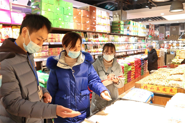 当阳市纪委监委靠前监督,持续跟进粮食和物资储备部门履职情况,确保疫情防控形势下粮油等基本生活物资稳定供应。图为该市纪检监察干部走访大型商超了解粮食储备供应情况。(宜昌市纪委监委)