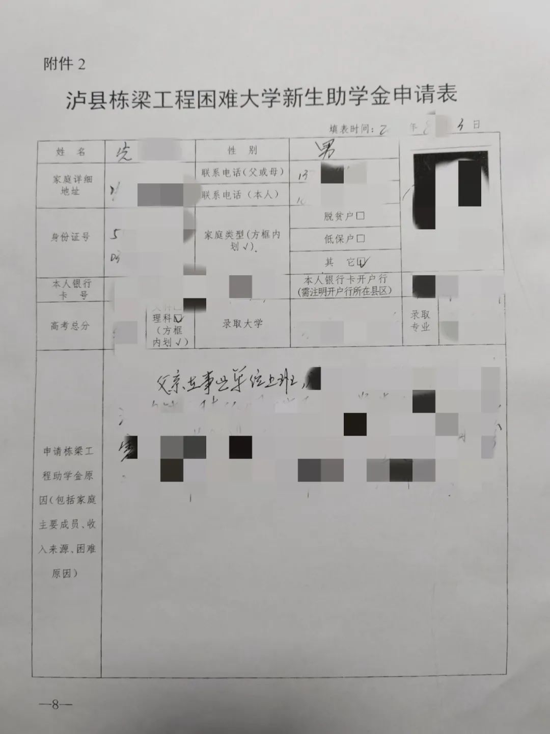 原来,泸县县委第一巡察组在对近几年的栋梁工程扶贫助学情况专项检查时,一张《泸县栋梁工程困难大学生助学金申请表》引起工作人员的注意——家庭情况简介一栏写着“父亲在事业单位上班”。