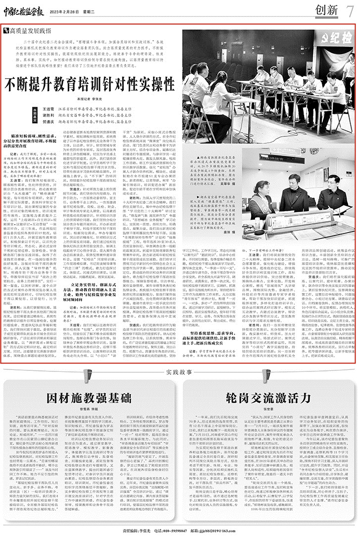 贺遵庆:针对师资力量上的供需脱节问题,我们坚持向内挖潜力、向外引助力,一方面推动委领导、室主任、业务骨干走上讲台,一方面邀请省市纪检监察、党校、法检、财会、审计等系统专家走入课堂,以高素质师资推动高质量培训。针对培训内容上的供需错位问题,我们坚持分级分层分类分专题开展培训,开办新进班子领导干部、科级干部和年轻干部培训班;根据岗位需求,举办专题培训,突出培训精准化。针对培训方式上的供需反差问题,我们通过组织监督执纪执法实务经验交流会、抽调上级跟班学习心得分享会、重大案件查办总结座谈会、职务犯罪案件庭审旁听会,设置“纪检法”同堂培训课、工作现场模拟课、书记面谈辅导课等“四会三课”的模式,着力打造探讨式、体验式、沉浸式培训课堂,让课堂动起来、兴趣浓起来、效果实起来。