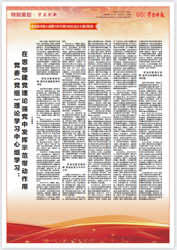 党委(党组)理论学习中心组学习,是各级党委(党组)领导班子和领导干部在职理论学习的重要组织形式,对于推动理论武装工作深入开展,提高领导干部的理论水平和工作能力,加强领导班子思想政治建设,具有重要意义。党的十八大以来,以习近平同志为核心的党中央高度重视领导干部学习、党委(党组)理论学习中心组学习,更加注重制度创新、实践创新和理论创新,采取了一系列创新举措加强领导干部在职理论学习,充分发挥各级党委(党组)理论学习中心组学习在思想建党、理论强党中的示范带动作用,为实现新时代新征程党的使命任务提供了坚强保障。