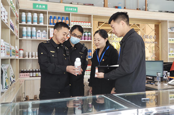 图为该县农业综合执法大队在农资商店了解相关情况