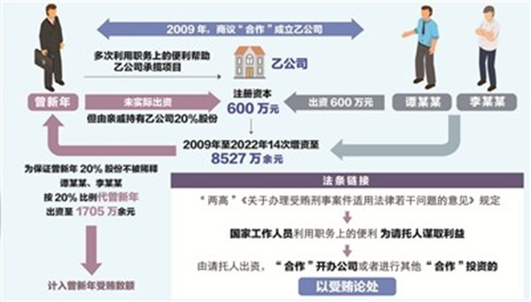 其中,2006年至2020年,曾新年接受李某某请托,利用职务便利为甲公司在项目承接等事项上提供帮助。2009年至2022年,曾新年在既未实际出资也未参与甲公司经营管理的情况下,收受甲公司“分红”共计740.35万元。