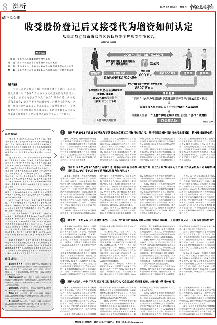这是一起党员领导干部利用职权为请托人谋利,并由请托人出资,以“合作”开办公司方式收受贿赂的典型案件。本案中,曾新年与李某某等人“合作”开办公司,由李某某代为出资,曾新年不参与经营管理,所获740余万元“分红”如何认定?谭某某、李某某在乙公司增资过程中,多次代曾新年出资确保其股份不被稀释,上述出资额是否应计入曾新年受贿数额?我们特邀相关单位工作人员予以解析。