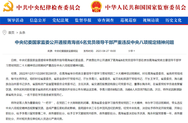 制定实施中央八项规定,是我们党在新时代的徙木立信之举。党的二十大以来,各级纪检监察机关以严的基调正风肃纪,看住节点、串点成线、久久为功,坚持每个月公布全国查处违反中央八项规定精神问题汇总情况,中央纪委国家监委提级审查调查并指导青海省纪委监委严肃查处并公开通报青海省6名党员领导干部严重违反中央八项规定精神问题,释放一抓到底、决不松懈的强烈信号,推动落实中央八项规定精神由徙木立信到化风成俗。