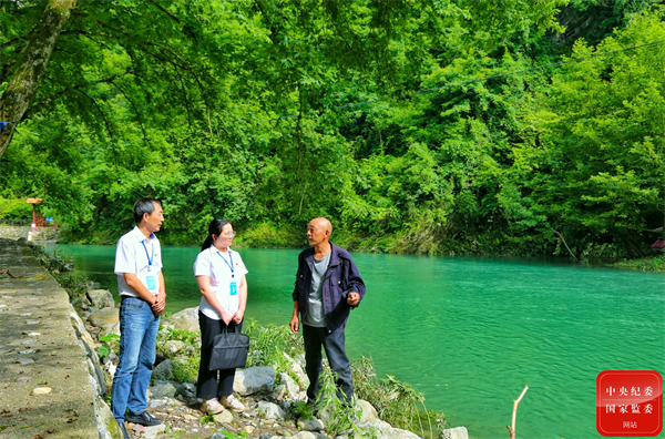 湖北省兴山县纪委监委拓展“1+N”工作机制覆盖面,统筹监督力量,聚焦河长制落实、水生态修复等重点工作开展流域综合治理专项监督,深入一线对岸线复绿、禁渔禁捕等政策落实情况跟进监督。图为该县流域综合治理监督专班工作人员在南阳镇文武村实地走访。(湖北省兴山县纪委监委 万晶晶 摄)