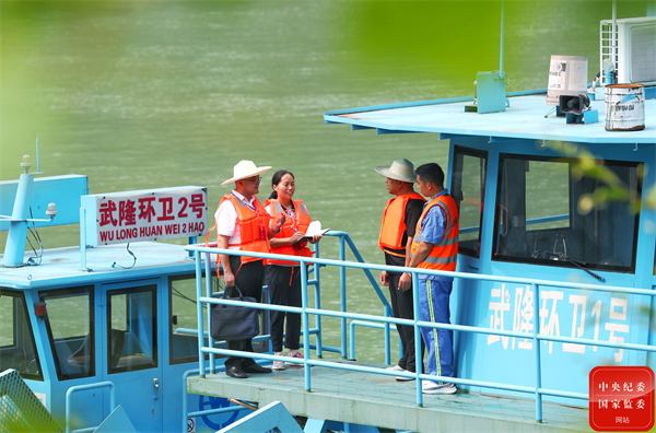 重庆市武隆区纪委监委将监督贯穿于污染防治攻坚战全过程,整合“室组地”监督力量,深入辖区内天然林场、河流开展专项督查,坚决整治生态环保领域腐败和作风问题。图为该区纪检监察干部在乌江武隆江口段了解中央环保决策部署落实情况。(重庆市武隆区纪委监委 黄锐 摄)