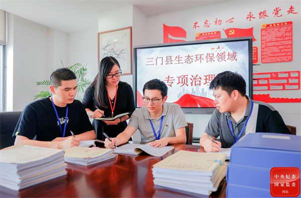 浙江省三门县纪委监委严查在监督执法、审批许可、问题整改等工作中履职不力、执法不严、权钱交易等作风和腐败问题,为保护“绿水青山”提供纪律保障。图为该县纪检监察干部对专项治理中的案件进行分析研判。(浙江省三门县纪委监委 陈昌晖 摄)