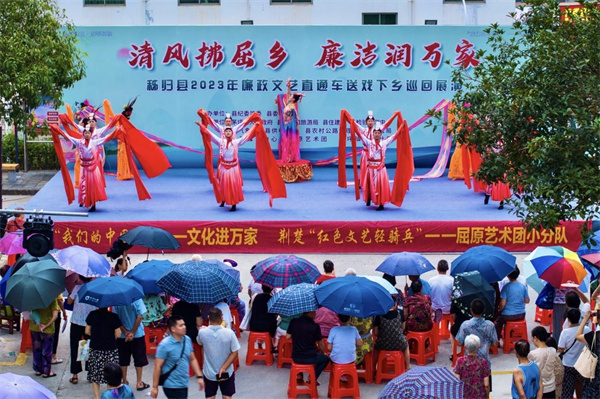 以“文”话廉,传递清风正气。秭归县充分盘活屈原廉洁文化特色,深挖廉政教育资源,不断探索接地气、入民心的廉洁文化文艺传播路径,让廉洁文化建设“沾泥土”“带露珠”“冒热气”,并依托公共文化服务载体,用群众喜闻乐见的形式开展廉政文艺送戏下乡活动,让老百姓“沉浸式”品廉味、听廉音、会廉意。图为该县纪委监委在茅坪镇长宁社区开展2023年廉政文艺直通车送戏下乡巡回展演。