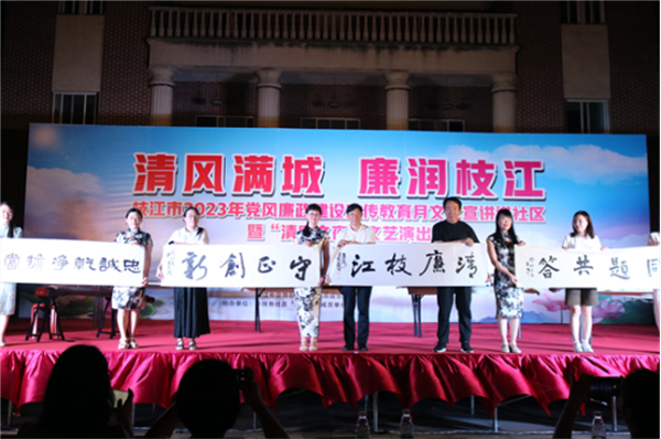 枝江市举办“清风满城 廉润枝江”2023年党风廉政建设宣传教育月暨“清廉之夜”文艺演出,通过系列丰富多彩、寓教于乐的廉政宣传教育活动,多角度、多层次、多形式诠释新时代廉洁文化内涵,为群众奉上廉洁文化视听盛宴的同时,展示枝江市清廉建设的成效,推动全面从严治党好声音持续飞入“寻常百姓家”。图为该市在马家店街道大礼堂广场开展“廉政文艺直通车”巡回展演活动。(宜昌市纪委监委)