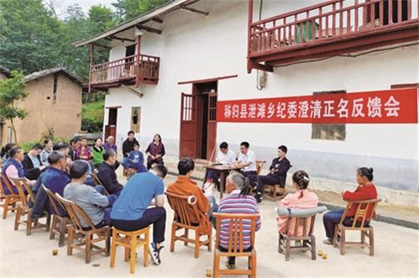 秭归县泄滩乡纪委在九条岭村召开澄清正名反馈会。 (宜昌市纪委监委提供)