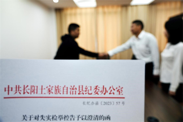 长阳土家族自治县纪委监委灵活运用书面澄清、当面澄清、通报澄清等方式为受到不实举报的干部澄清正名,同时加大恶意举报惩处力度,积极营造风清气正的政治生态。图为该县纪委监委向受到失实举报干部送达《关于对失实检举控告予以澄清的函》。(宜昌市纪委监委)