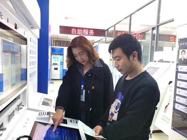 图为该市高坝洲镇中光社区纪检委员引导群众使用自助终端办理业务