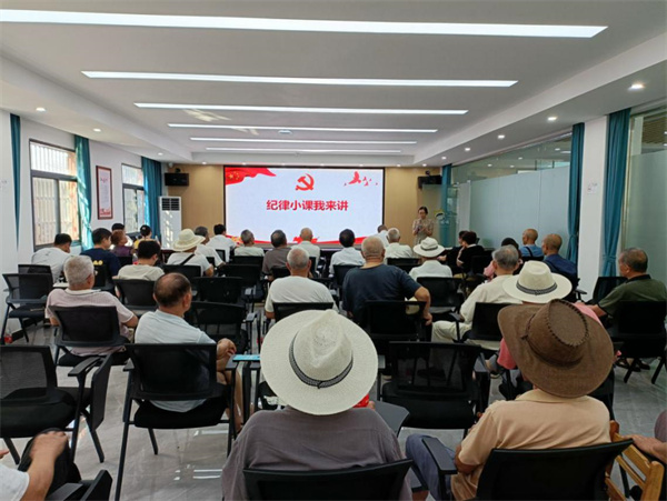 “融”在日常抓。将“纪律教育在支部”深度嵌入每月支部主题党日活动,固定开展“诵纪、知纪、敬纪、释纪、评纪”规定动作,打造经常性纪律教育有形载体。图为大堰湾社区面向居民党员群体开展“纪法小课我来讲”。
