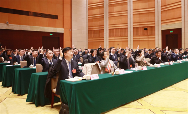 图为与会代表举手表决,一致通过三次全会工作报告。