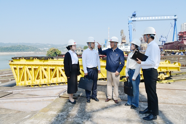 西陵区年轻纪检监察干部在结对导师的带领下,针对辖区某造船企业非法侵占岸线问题现场了解情况。