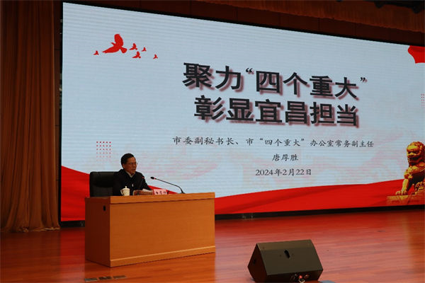 图为宜昌市委副秘书长、市“四个重大”办公室常务副主任唐厚胜围绕市委“四个重大”专题开展授课