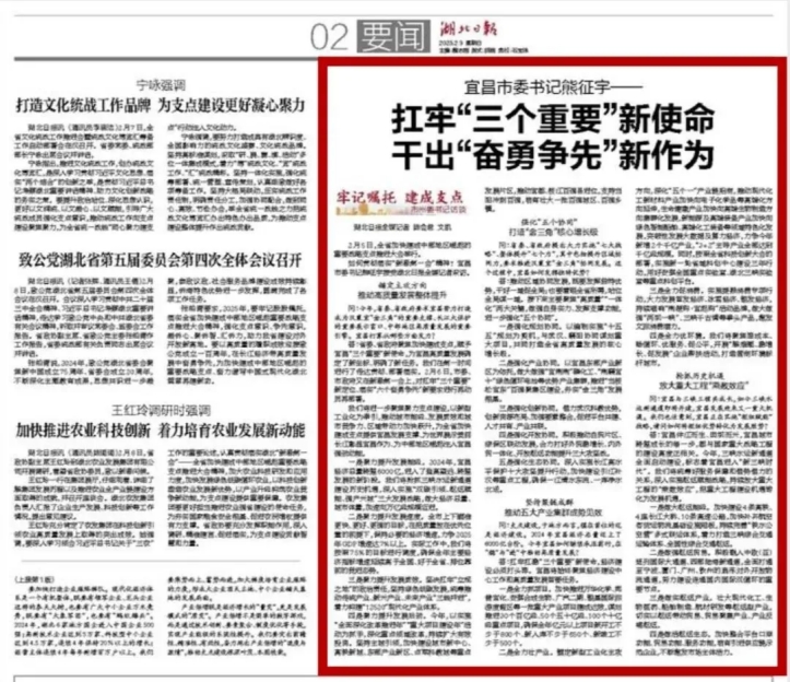 2月5日,全省加快建成中部地区崛起的重要战略支点推进大会举行。如何贯彻落实“新春第一会”精神?2月9日,《湖北日报》刊发专访宜昌市委书记熊征宇的报道《扛牢“三个重要”新使命 干出“奋勇争先”新作为》。