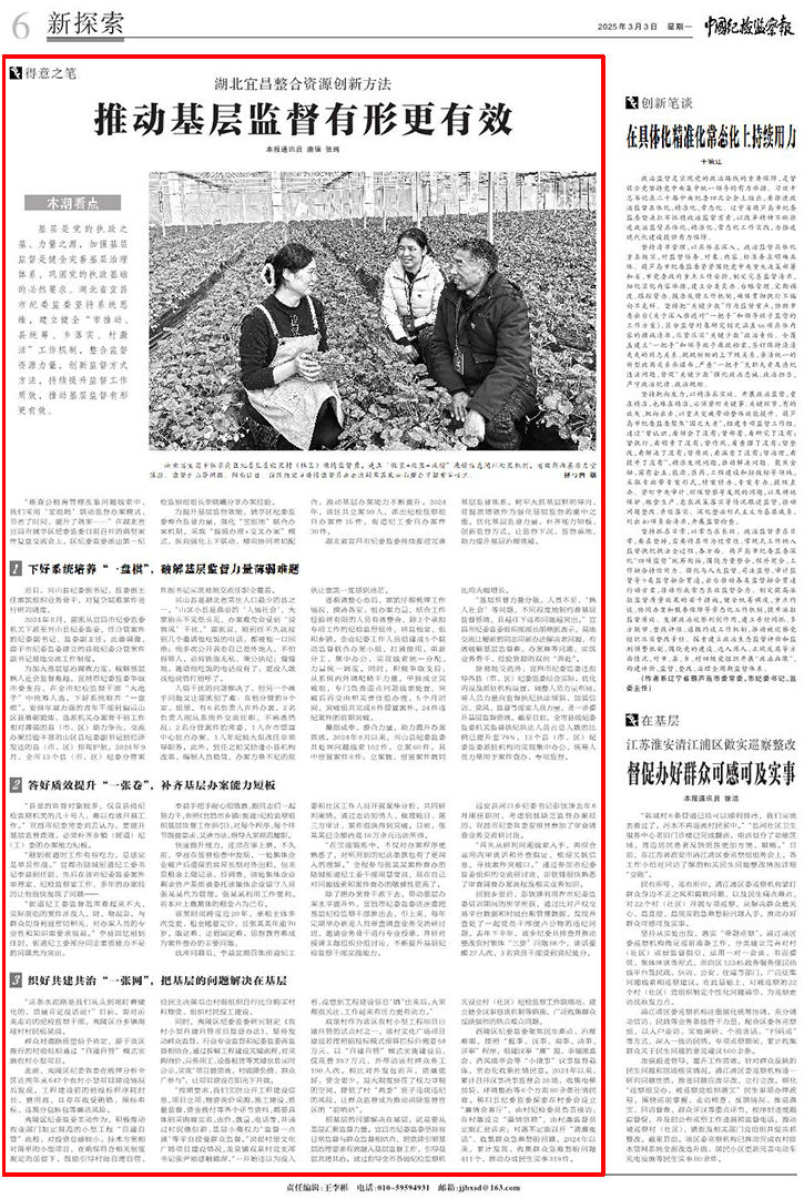 湖北省宜昌市纪委监委持续推进完善基层监督体系,树牢大抓基层鲜明导向,将提质增效作为强化基层监督的重中之重,优化基层监督力量、补齐能力短板、创新监督方式,让监督下沉、监督落地,助力提升基层治理效能。