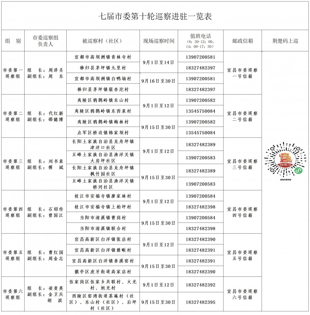 据悉,本轮巡察工作时间1个月左右。其间,市委各巡察组设立专门值班电话、邮政信箱和“荆楚码上巡”信访反映二维码,主要受理涉及被巡察村(社区)“两委”班子及其成员的问题反映。现场巡察期间,值班电话受理时间为8:30至17:30。其他不属于巡察受理范围的信访问题,将按规定转交有关部门处理。